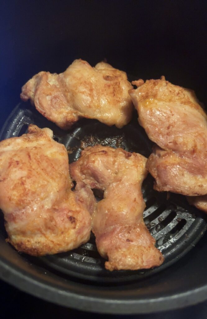 - Air fry the thighs for 18 minutes, flipping the thighs halfway through for even cooking.