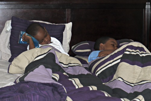 I don’t know what is going on with Sean this week. He is a little accident magnet. When I came home from my birthday dinner on Monday night, Reggie casually mentioned that he had fallen off the bed after playing around. The next morning I realized that he had fallen on his head – because there was a dark red bruise on his forehead and the side of his face. THEN, he hit his head on a metal box at the edge of the sidewalk on our way home after picking Michael up from karate class yesterday. That led to a little knot on the top of his head! He fell asleep last night with an ice pack on his head. Two accidents in two days…he just needs to sit his little self down today!