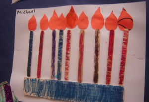 You can learn more about Shalom Sesame at www.shalomsesame.org. Meanwhile, I will leave you with Michael’s 2008 Hanukkah art and singing (audio only), since he hasn’t done anything this year yet!