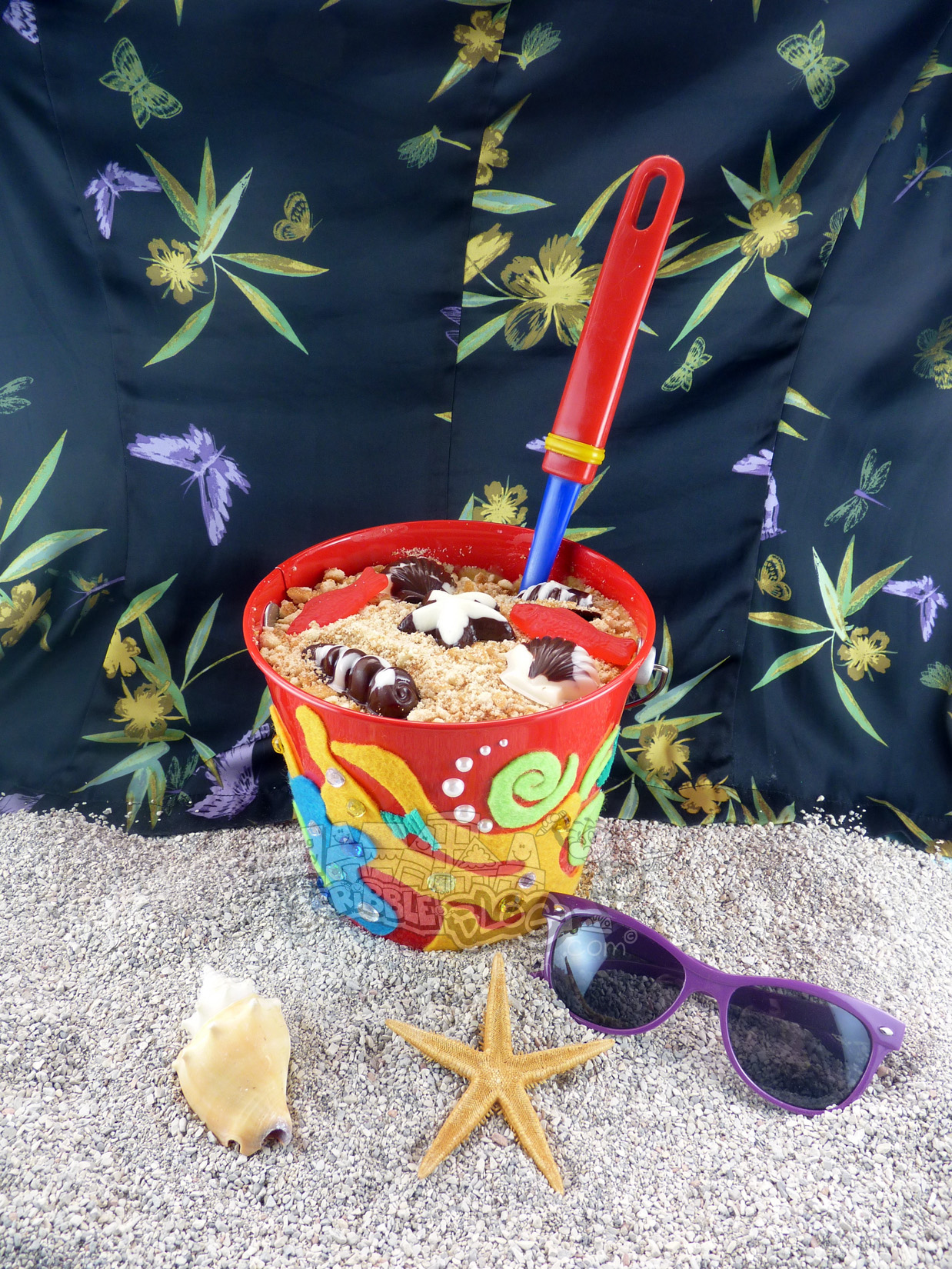 When you are ready for your dessert, remove the cake from the fridge and put a sand shovel into the top of the cake. Decorate the top of the cake with the chocolate shells and Swedish Fish. Present your cake and enjoy!