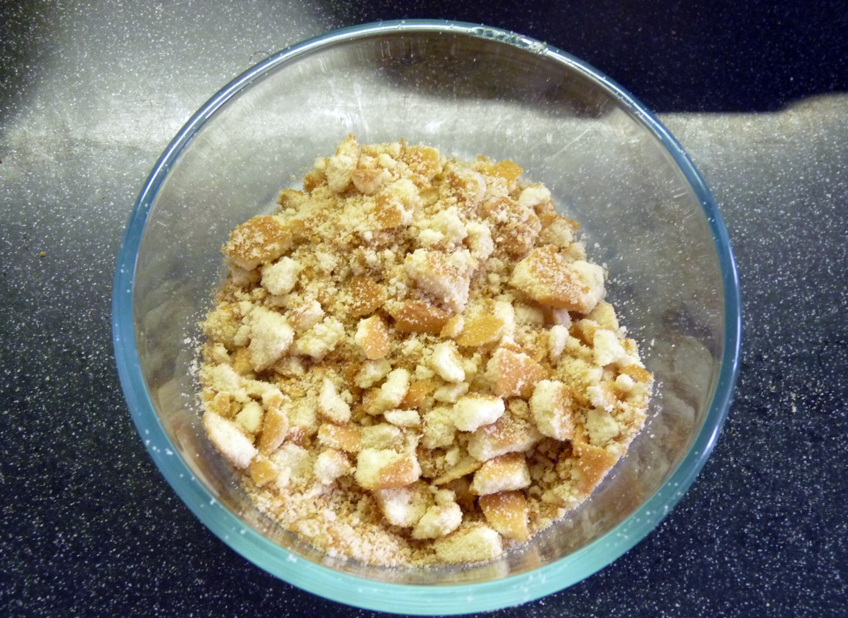 Once you’ve laid the last layer of pudding, completely cover this layer with the fine-mashed, “sand”–like wafers…no chunks this time.
