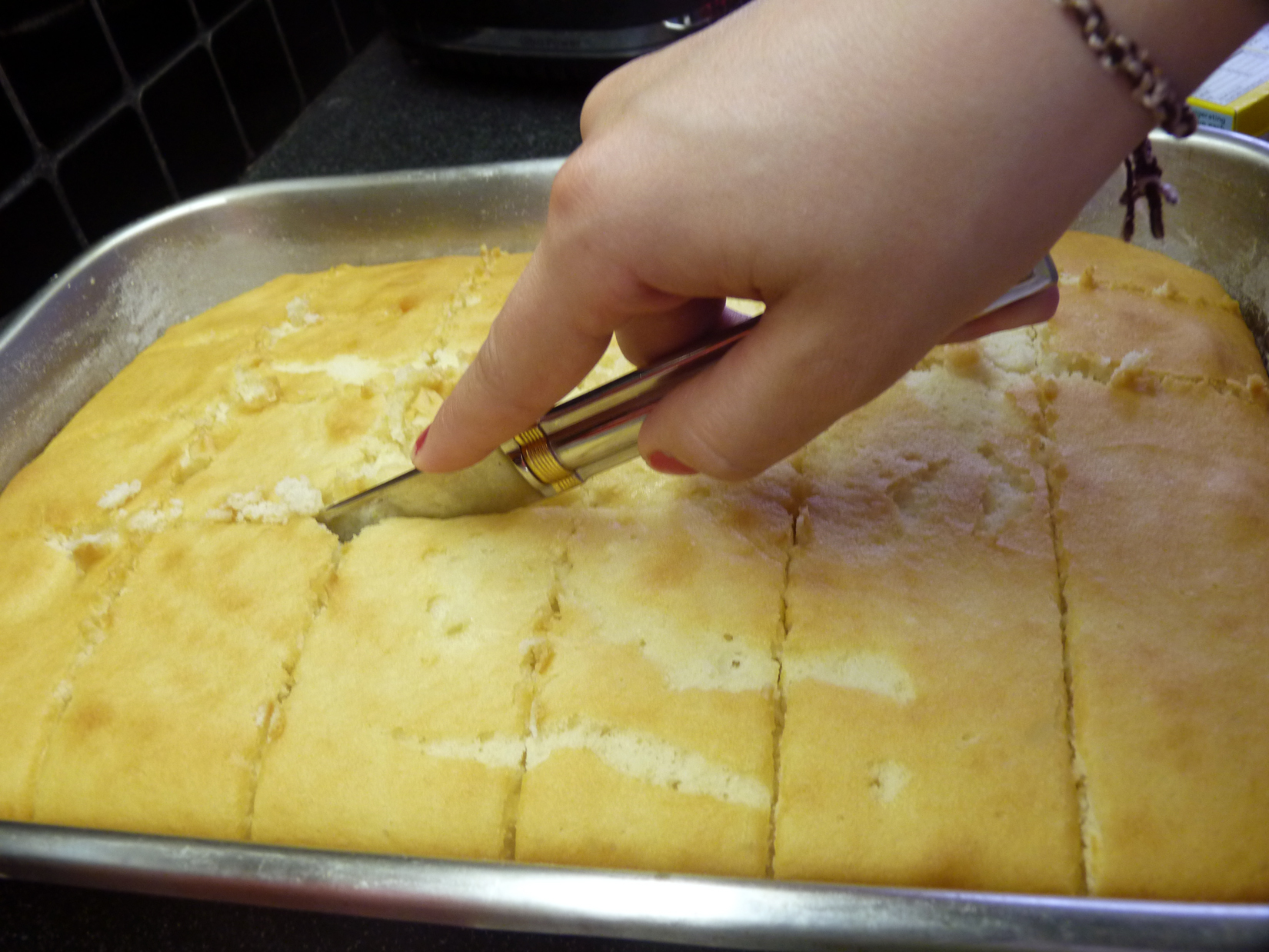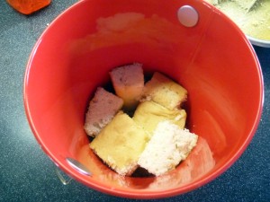 Once the cake is cooled, slice it up into 1 x 2” cubes.