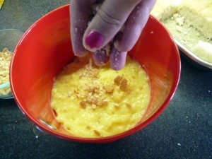 Place a thin layer of mashed wafers into the bottom of the pail. Mix up the “sand” piece with the chunks.