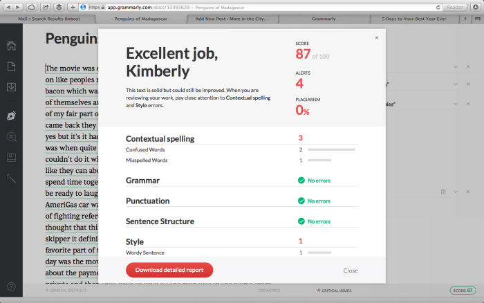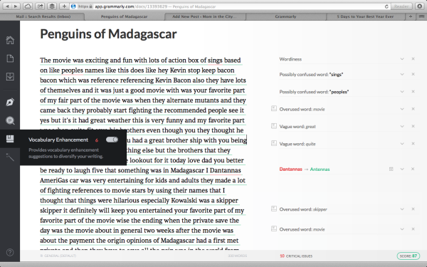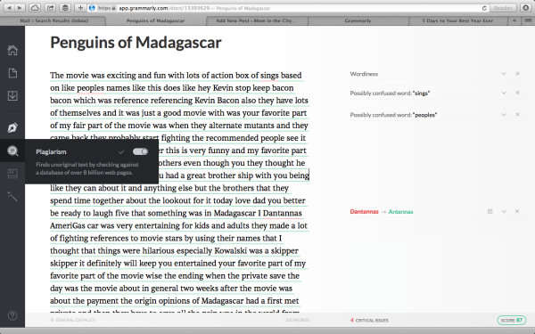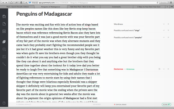 After logging into my premium account, I pasted some dictated notes (my sons’ recorded reactions to the Penguins of Madagascar movie) into a new Grammarly document.
