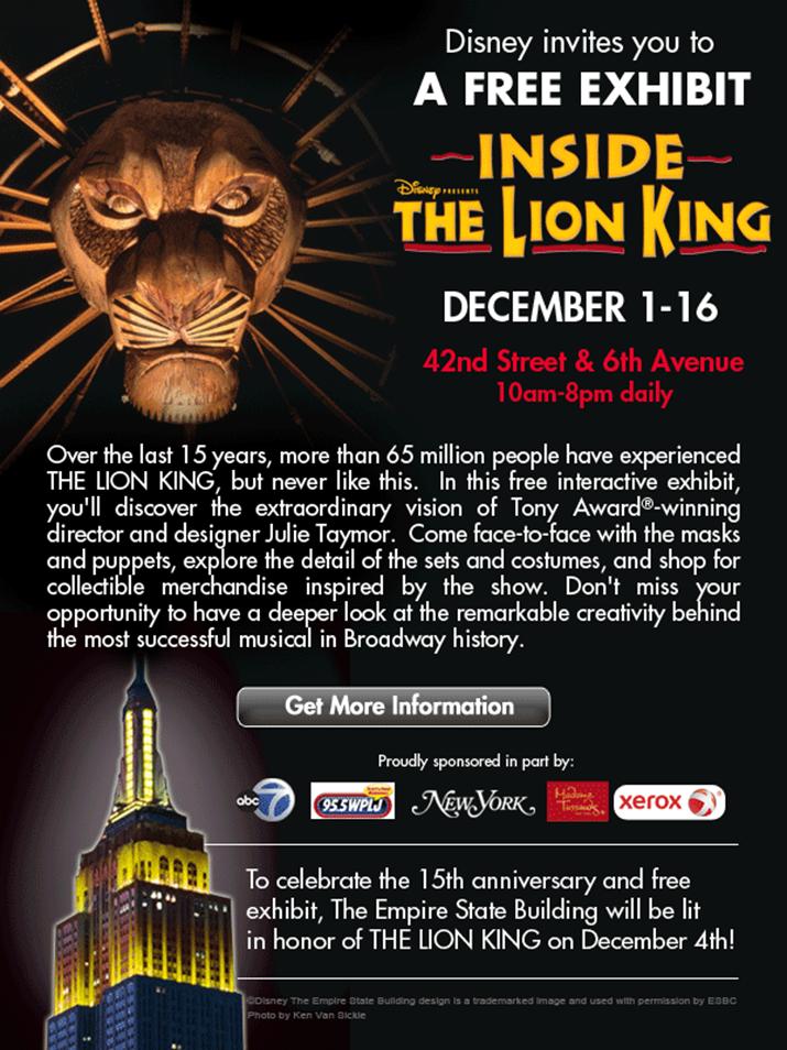 Hakuna Matata! If you or your kids enjoyed The Lion King movie, then visit the free “Inside the Lion King” pop-up exhibit in midtown Manhattan. There, you will be able to see a variety of items from inside of the Lion King theatrical show. The free interactive exhibit will run from December 1st to December 16th in celebration of the 15 years of The Lion King on Broadway. Be certain to check their site for the schedule of special interactive workshop events (storytelling, music, movement and design) that are designed for kids ages 6+ who are accompanied by a guardian.