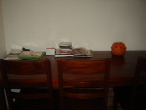 So here (minus the pumpkin) is what my table surface looked like in the past and will look like from now on (give or take a few carefully selected decorations!)…