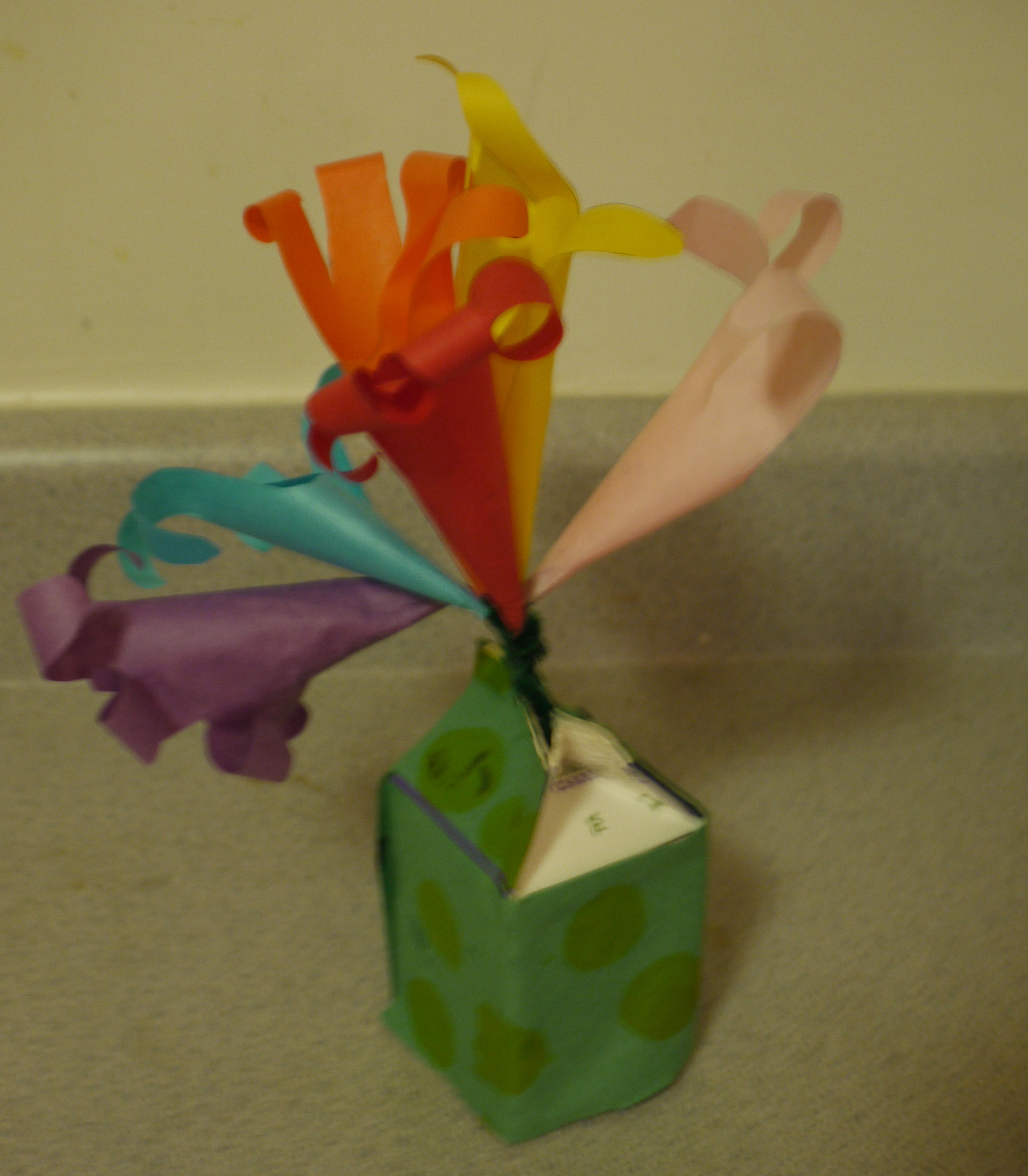 Of course, beauty is in the eye of the beholder – they were beautiful because he made them for me at preschool. The leaves are actually his handprints traced on colored paper and rolled together. He also hand stamped the construction paper covering the milk carton “vase”. He was so proud of himself when he gave me the craft. It just made my heart melt!