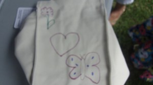 Later, we decorated lunch bags for the program. I asked Isabel, Jennifer’s adorable daughter what I should draw on my bag, so I ended up drawing a heart, butterfly and flower. It was nice and simple. I liked it, I hope that the kid who gets it a.) is a girl and b.) enjoys it!